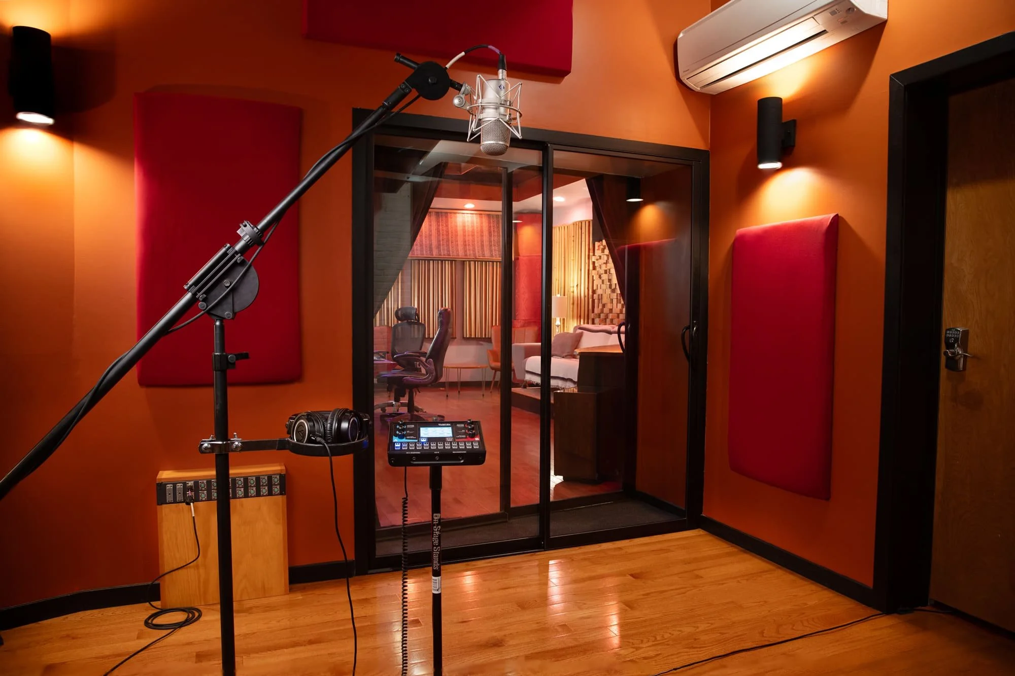 Dedicated vocal booth with direct sight lines to the control room, perfect for vocal sessions.